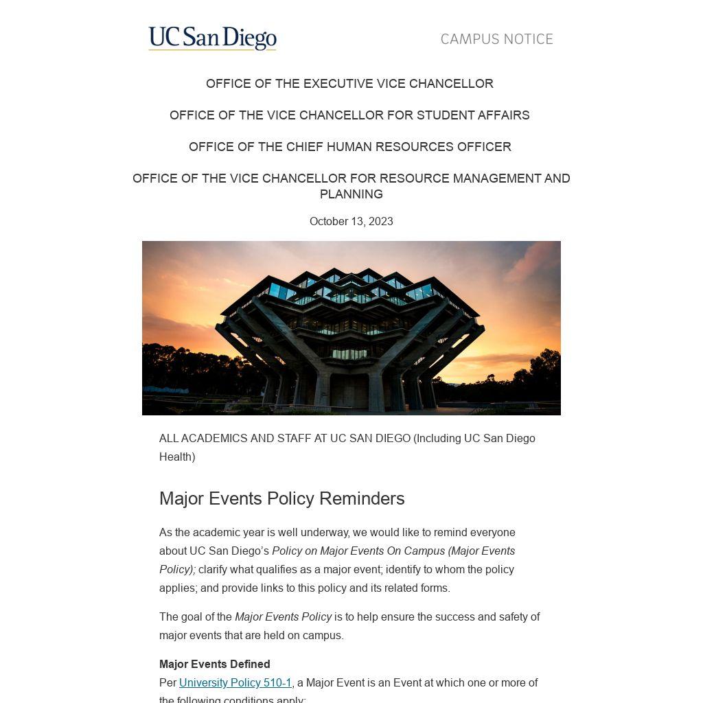 As the academic year is well underway, we would like to remind everyone about UC San Diego’s Policy on Major Events On Campus (Major Events Policy); clarify what qualifies as a major event; identify to whom the policy applies; and provide links to this policy and its related forms.