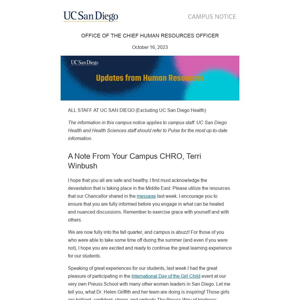 The information in this campus notice applies to campus staff. UC San Diego Health and Health Sciences staff should refer to Pulse for the most up-to-date information.