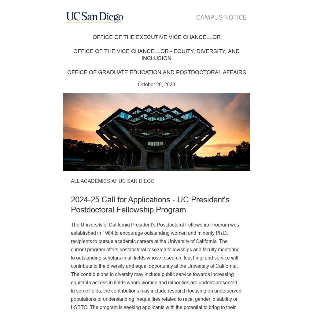 We encourage you to share this opportunity with diverse Ph.D. candidates and early postdocs with potential for a faculty career at the University of California. We also encourage departments to take advantage of the hiring incentive and the opportunity to recruit highly accomplished and UC mentored scholars to our campus.