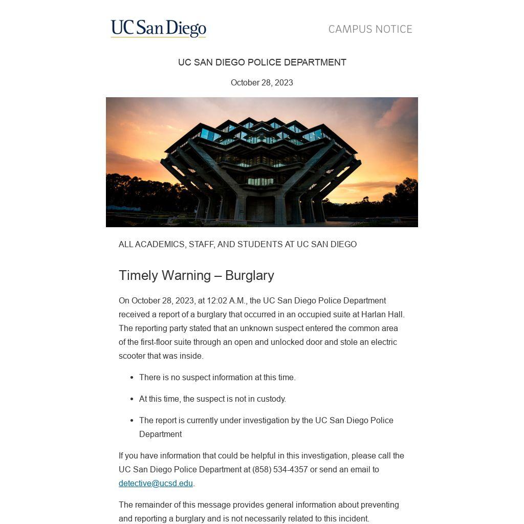 On October 28, 2023, at 12:02 A.M., the UC San Diego Police Department received a report of a burglary that occurred in an occupied suite at Harlan Hall. The reporting party stated that an unknown suspect entered the common area of the first-floor suite through an open and unlocked door and stole an electric scooter that was inside.