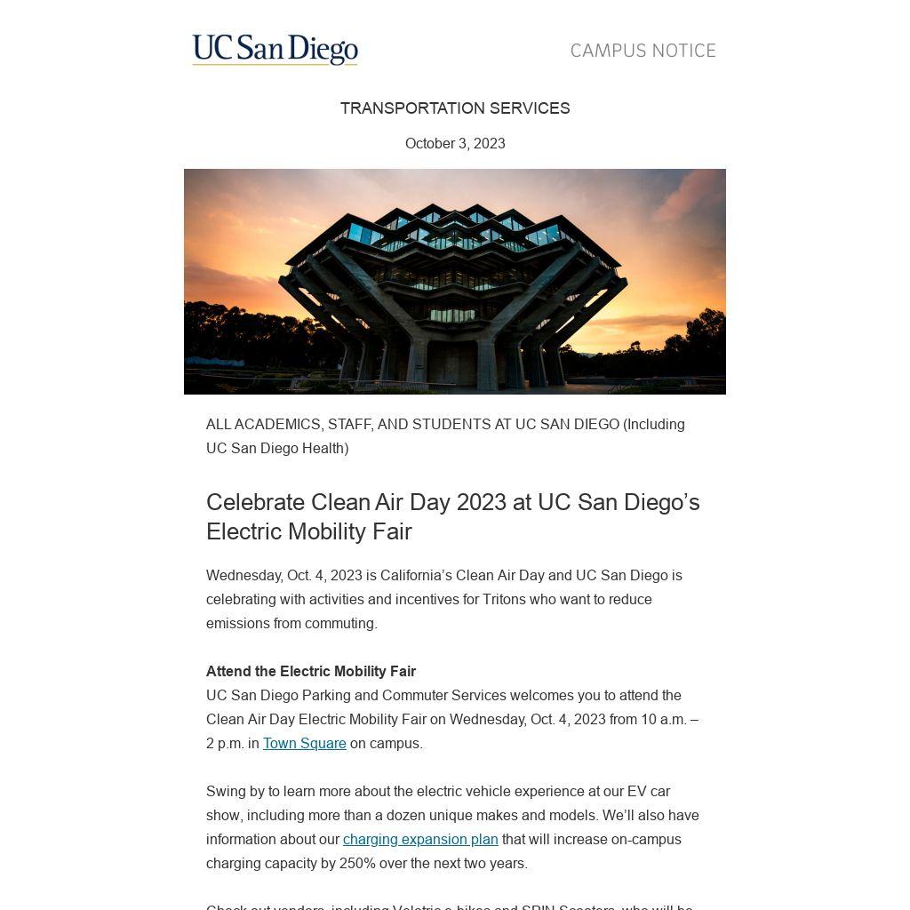 Oct. 4, 2023 is California’s Clean Air Day and UC San Diego is celebrating with activities and incentives for Tritons who want to reduce emissions from commuting.