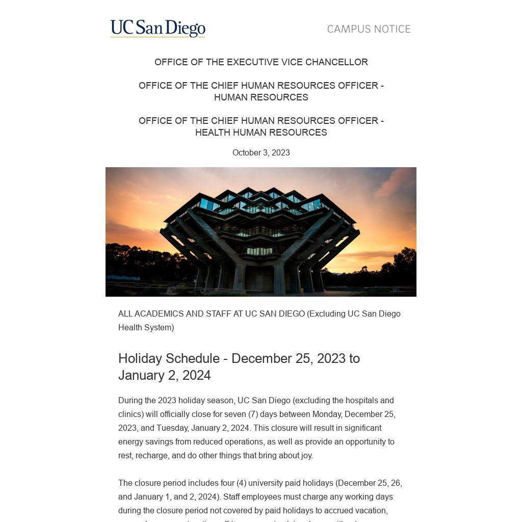 the 2023 holiday season, UC San Diego (excluding the hospitals and clinics) will officially close for seven (7) days between Monday, December 25, 2023, and Tuesday, January 2, 2024. This closure will result in significant energy savings from reduced operations, as well as