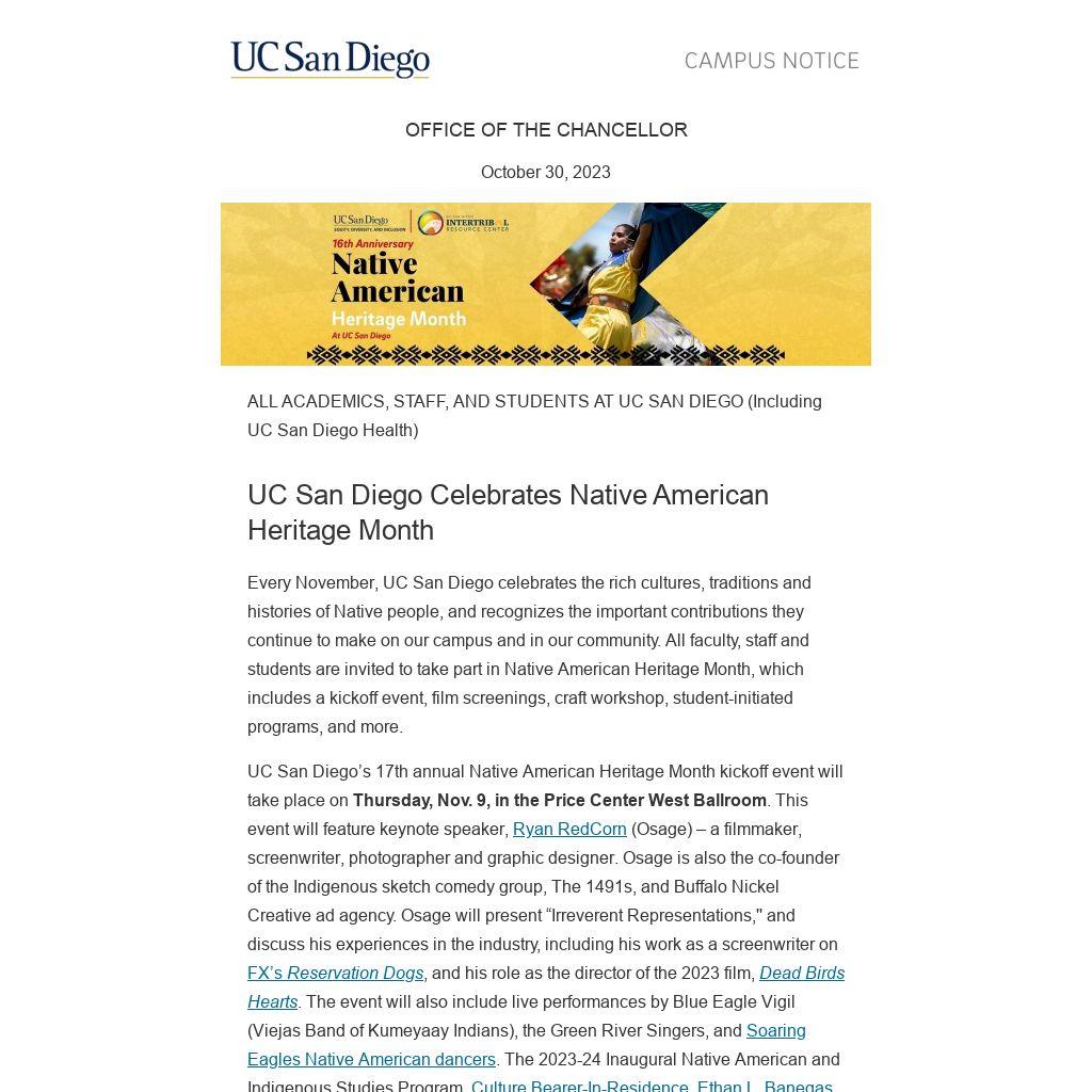 UC San Diego’s 17th annual Native American Heritage Month kickoff event will take place on Thursday, Nov. 9, in the Price Center West Ballroom. This event will feature keynote speaker, Ryan RedCorn (Osage) – a filmmaker, screenwriter, photographer and graphic designer. Osage is also the co-founder of the Indigenous sketch comedy group, The 1491s, and Buffalo Nickel Creative ad agency. Osage will present “Irreverent Representations,'' and discuss his experiences in the industry, including his work as a screenwriter on FX’s Reservation Dogs, and his role as the director of the 2023 film, Dead Birds Hearts. The event will also include live performances by Blue Eagle Vigil (Viejas Band of Kumeyaay Indians), the Green River Singers, and Soaring Eagles Native American dancers. The 2023-24 Inaugural Native American and Indigenous Studies Program, Culture Bearer-In-Residence, Ethan L. Banegas (Kumeyaay, Payómkawichum, and Kuupangaxwichem), will also be in attendance, supporting the minor and doctoral certificate in Native American and Indigenous Studies (NAIS), and the work of the Intertribal Resource Center (ITRC).
