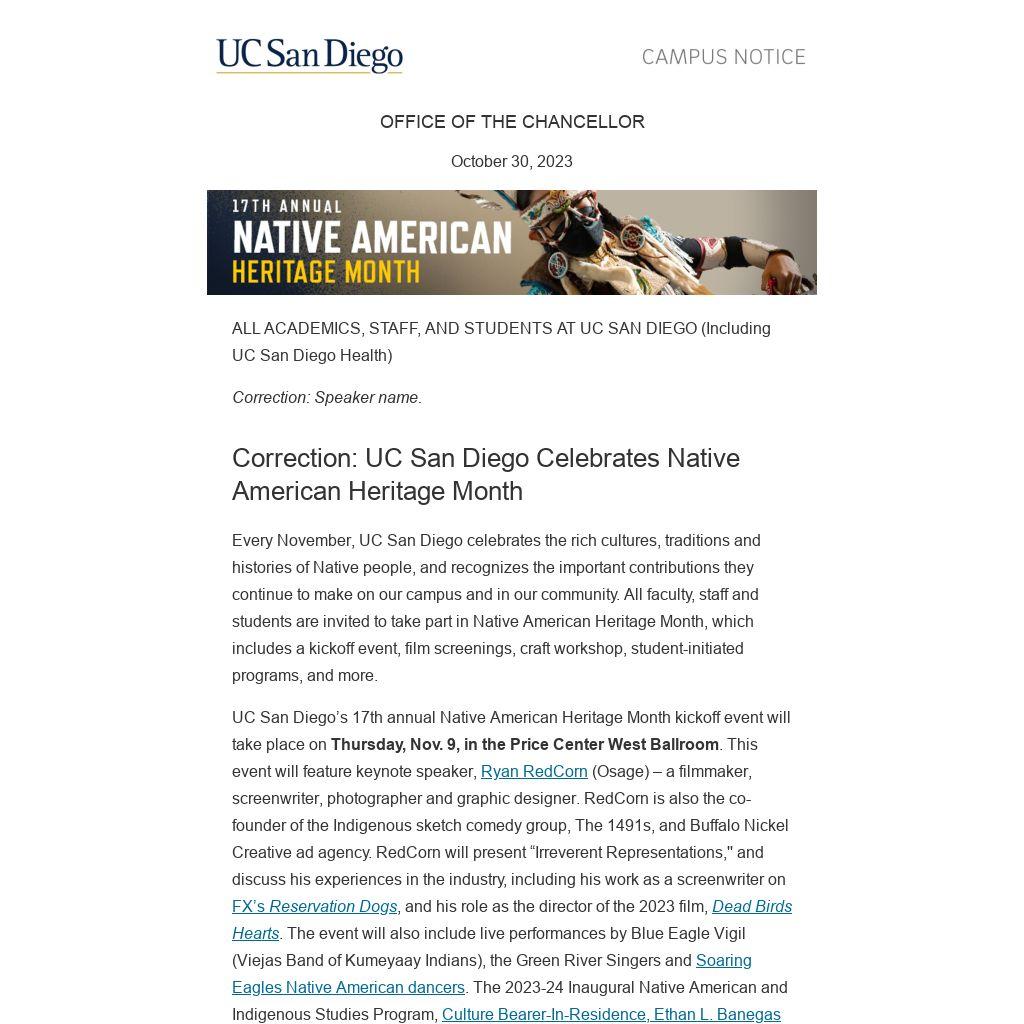 UC San Diego’s 17th annual Native American Heritage Month kickoff event will take place on Thursday, Nov. 9, in the Price Center West Ballroom. This event will feature keynote speaker, Ryan RedCorn (Osage) – a filmmaker, screenwriter, photographer and graphic designer. RedCorn is also the co-founder of the Indigenous sketch comedy group, The 1491s, and Buffalo Nickel Creative ad agency. RedCorn will present “Irreverent Representations,'' and discuss his experiences in the industry, including his work as a screenwriter on FX’s Reservation Dogs, and his role as the director of the 2023 film, Dead Birds Hearts. The event will also include live performances by Blue Eagle Vigil (Viejas Band of Kumeyaay Indians), the Green River Singers and Soaring Eagles Native American dancers. The 2023-24 Inaugural Native American and Indigenous Studies Program, Culture Bearer-In-Residence, Ethan L. Banegas (Kumeyaay, Payómkawichum and Kuupangaxwichem), will also be in attendance, supporting the minor and doctoral certificate in Native American and Indigenous Studies (NAIS), and the work of the Intertribal Resource Center (ITRC).