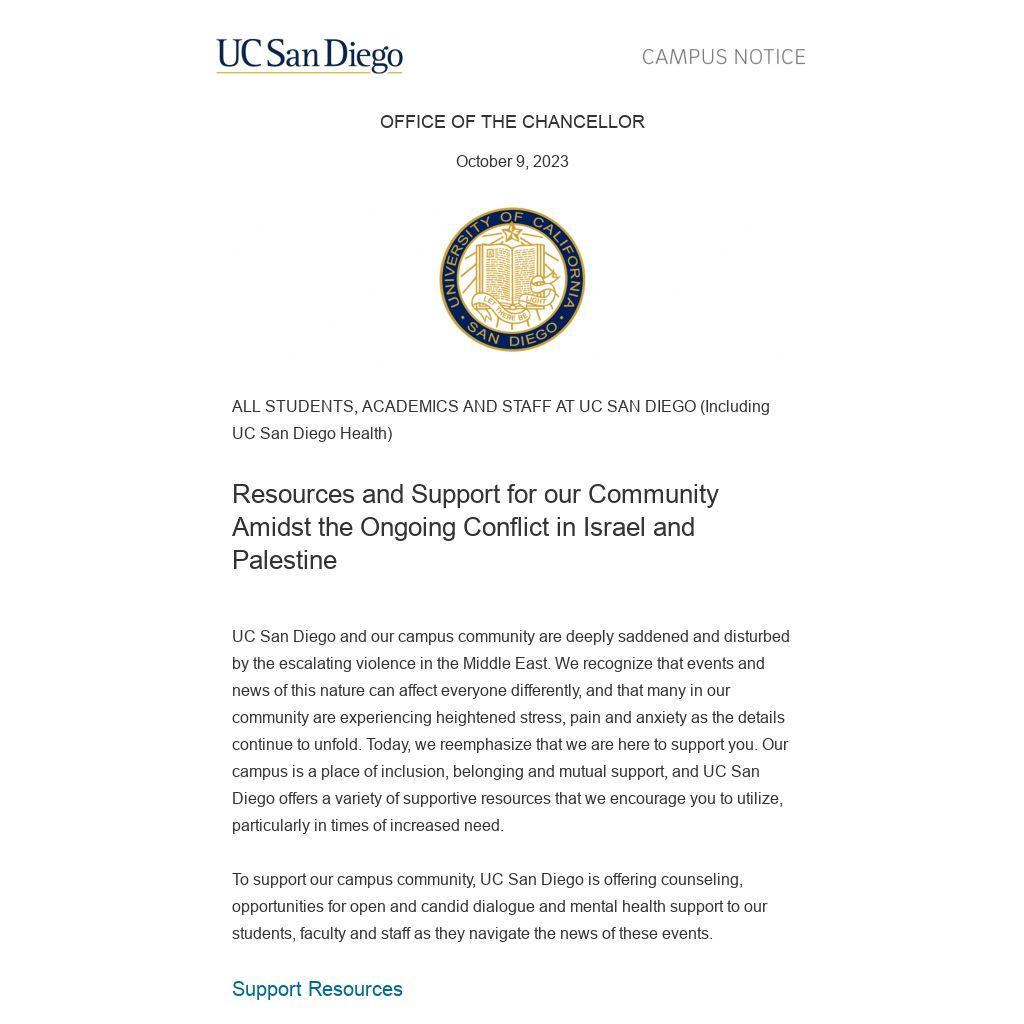 UC San Diego and our campus community are deeply saddened and disturbed by the escalating violence in the Middle East. We recognize that events and news of this nature can affect everyone differently, and that many in our community are experiencing heightened stress, pain and anxiety as the details continue to unfold. Today, we reemphasize that we are here to support you. Our campus is a place of inclusion, belonging and mutual support, and UC San Diego offers a variety of supportive resources that we encourage you to utilize, particularly in times of increased need.