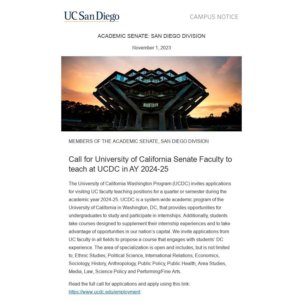 The University of California Washington Program (UCDC) invites applications for visiting UC faculty teaching positions for a quarter or semester during the academic year 2024-25. UCDC is a system-wide academic program of the University of California in Washington, DC, that provides opportunities for undergraduates to study and participate in internships. Additionally, students take courses designed to supplement their internship experiences and to take advantage of opportunities in our nation’s capital. We invite applications from UC faculty in all fields to propose a course that engages with students’ DC experience. The area of specialization is open and includes, but is not limited to, Ethnic Studies, Political Science, International Relations, Economics, Sociology, History, Anthropology, Public Policy, Public Health, Area Studies, Media, Law, Science Policy and Performing/Fine Arts.