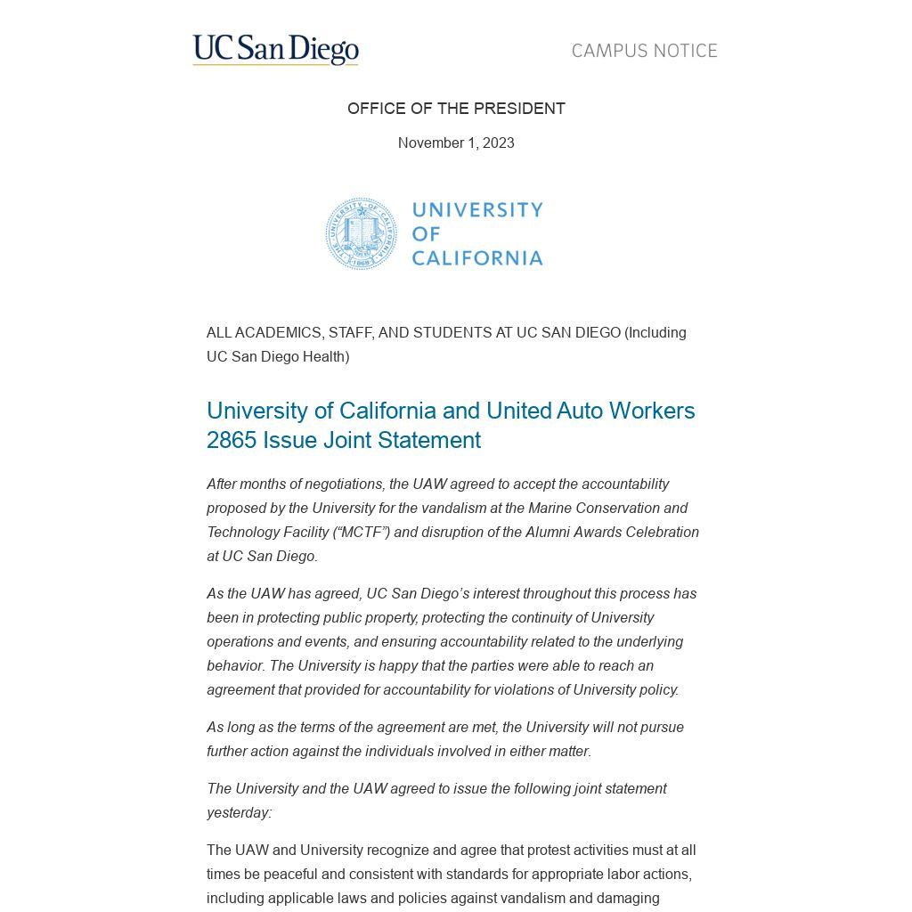 After months of negotiations, the UAW agreed to accept the accountability proposed by the University for the vandalism at the Marine Conservation and Technology Facility (“MCTF”) and disruption of the Alumni Awards Celebration at UC San Diego.
