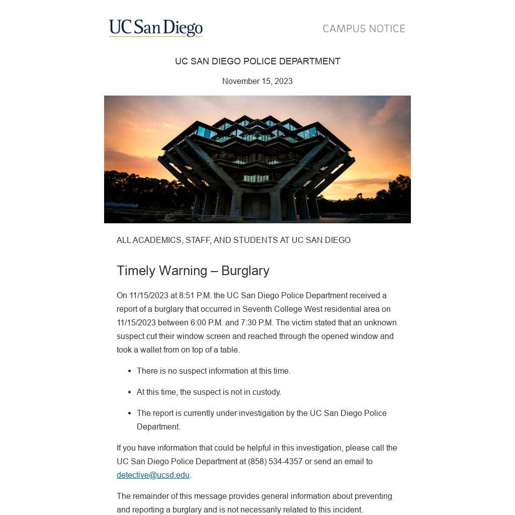 On 11/15/2023 at 8:51 P.M. the UC San Diego Police Department received a report of a burglary that occurred in Seventh College West residential area on 11/15/2023 between 6:00 P.M. and 7:30 P.M. The victim stated that an unknown suspect cut their window screen and reached through the opened window and took a wallet from on top of a table.