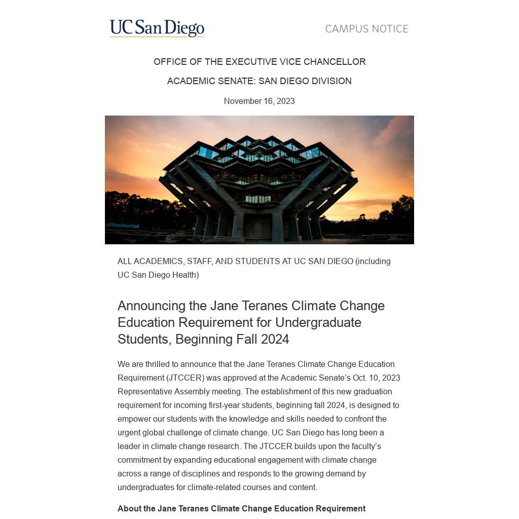 The Academic Senate is in the process of forming a new Senate committee, the Jane Teranes Climate Change Education Requirement Committee, to oversee implementation. The committee will be charged with finalizing the criteria for JTCCER courses and reviewing existing courses that address climate change. A call will be sent later this academic year inviting instructors, programs, and departments to submit proposals to add courses to the list approved to satisfy the JTCCER. The call will include information on the course criteria and proposal guidelines. An amendment to add the JTCCER to the Senate Regulation for undergraduate campuswide graduation requirements (SD Regulation 600) will be posted to the Senate website in December.