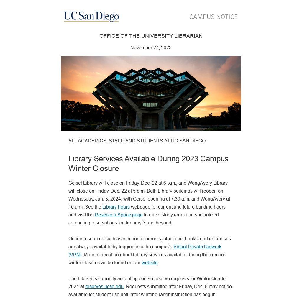 Geisel Library will close on Friday, Dec. 22 at 6 p.m., and WongAvery Library will close on Friday, Dec. 22 at 5 p.m. Both Library buildings will reopen on Wednesday, Jan. 3, 2024, with Geisel opening at 7:30 a.m. and WongAvery at 10 a.m. See the Library hours webpage for current and future building hours, and visit the Reserve a Space page to make study room and specialized computing reservations for January 3 and beyond.