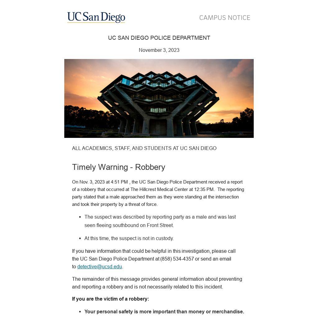 On Nov. 3, 2023 at 4:51 PM , the UC San Diego Police Department received a report of a robbery that occurred at The Hillcrest Medical Center at 12:35 PM. The reporting party stated that a male approached them as they were standing at the intersection and took their property by a threat of force.