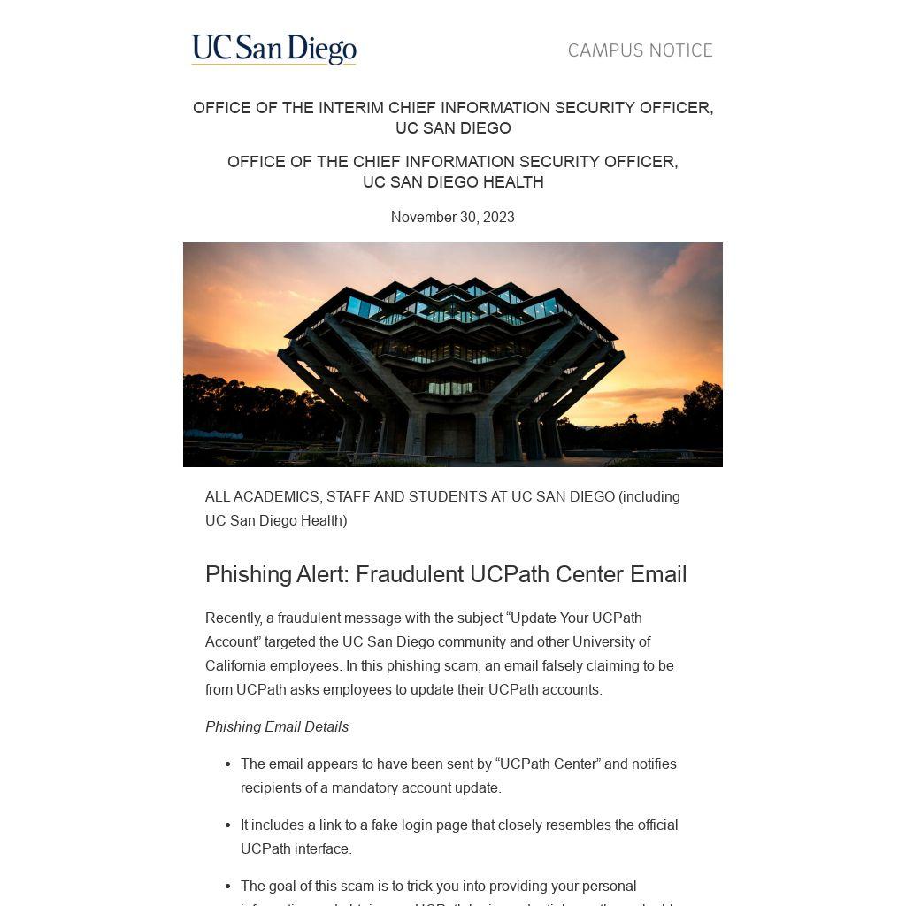 Recently, a fraudulent message with the subject “Update Your UCPath Account” targeted the UC San Diego community and other University of California employees. In this phishing scam, an email falsely claiming to be from UCPath asks employees to update their UCPath accounts.