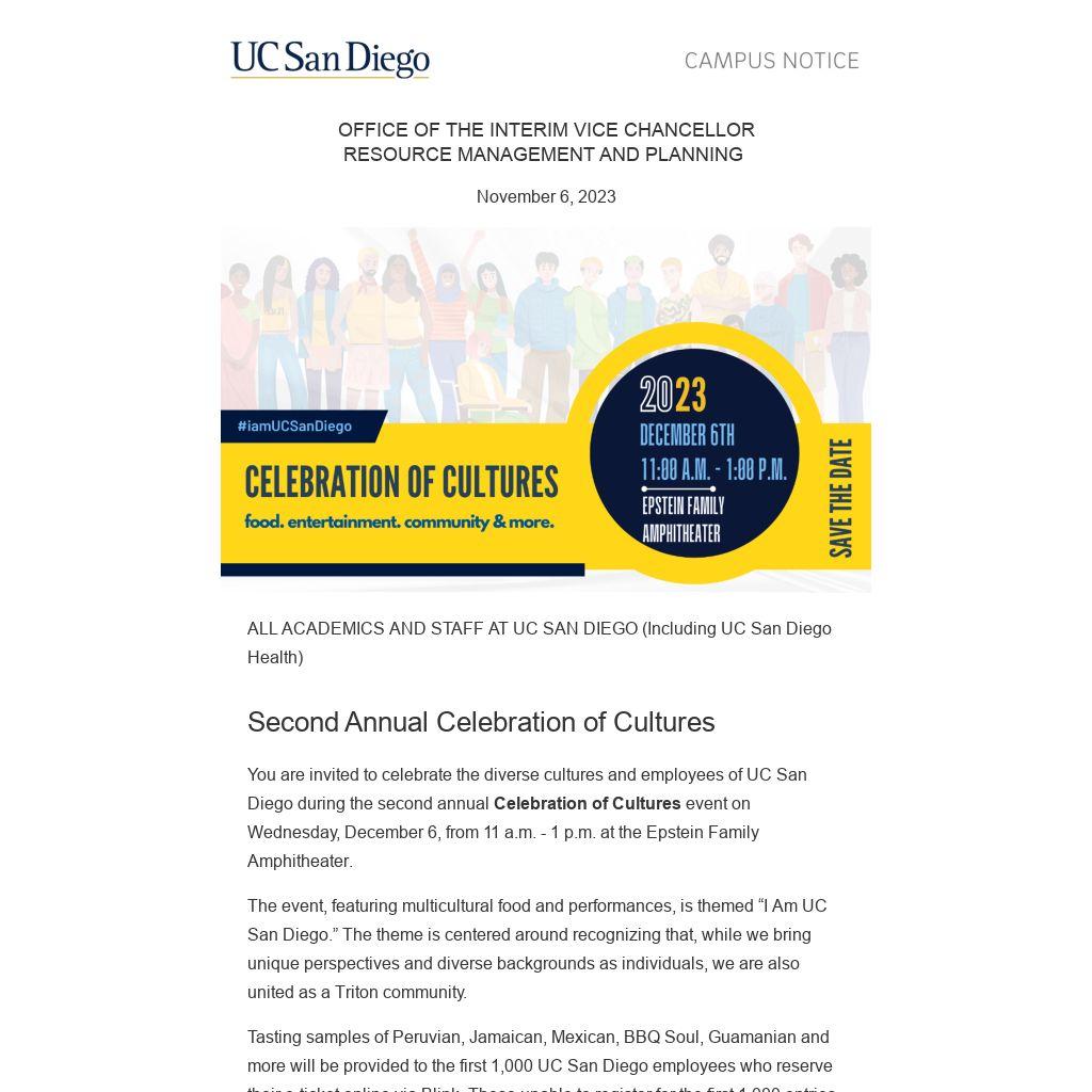 You are invited to celebrate the diverse cultures and employees of UC San Diego during the second annual Celebration of Cultures event on Wednesday, December 6, from 11 a.m. - 1 p.m. at the Epstein Family Amphitheater.