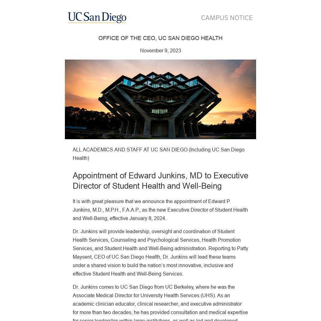 We look forward to Dr. Junkins joining the UC San Diego leadership team and supporting him in future initiatives to expand and sustain the systems and services that best support our students. We are confident that our community will connect with a compassionate and intentional leader who truly cares about our students.