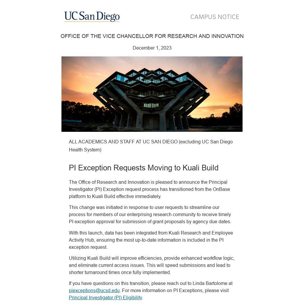 The Office of Research and Innovation is pleased to announce the Principal Investigator (PI) Exception request process has transitioned from the OnBase platform to Kuali Build effective immediately.