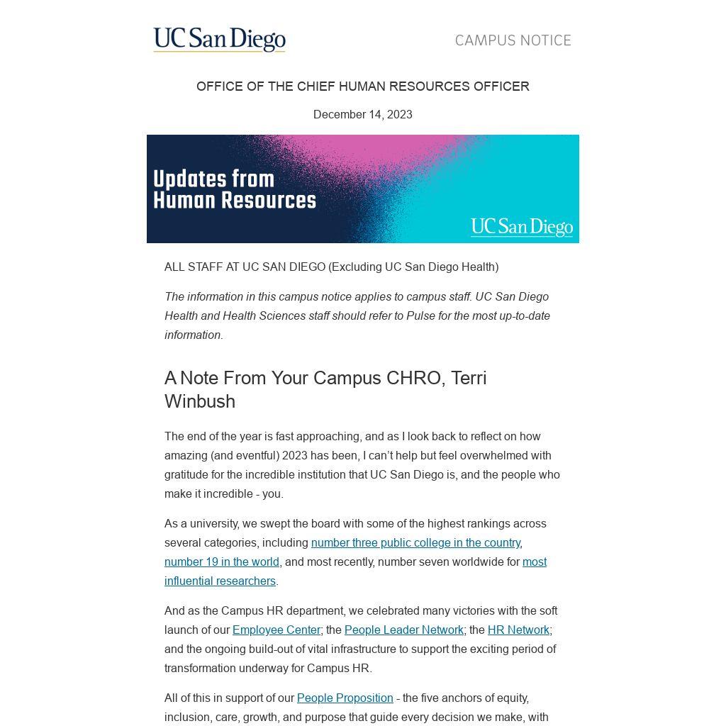 Curtailment/Winter Closure Reminder As announced in October, UC San Diego (excluding the hospitals and clinics) will officially close for seven (7) days between Monday, December 25, 2023, and Tuesday, January 2, 2024. Many reached out concerned because the dates established by UC San Diego are different from the dates listed by UCPath. I assured you in last month’s Updates from HR that the dates in the campus notice are correct, and they remain correct and will remain that way. If you have payroll-related questions surrounding curtailment, you can see dates on our Payroll page.