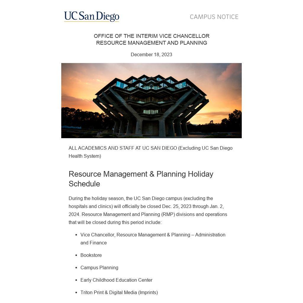During the holiday season, the UC San Diego campus (excluding the hospitals and clinics) will officially be closed Dec. 25, 2023 through Jan. 2, 2024. Resource Management and Planning (RMP) divisions and operations that will be closed during this period include: