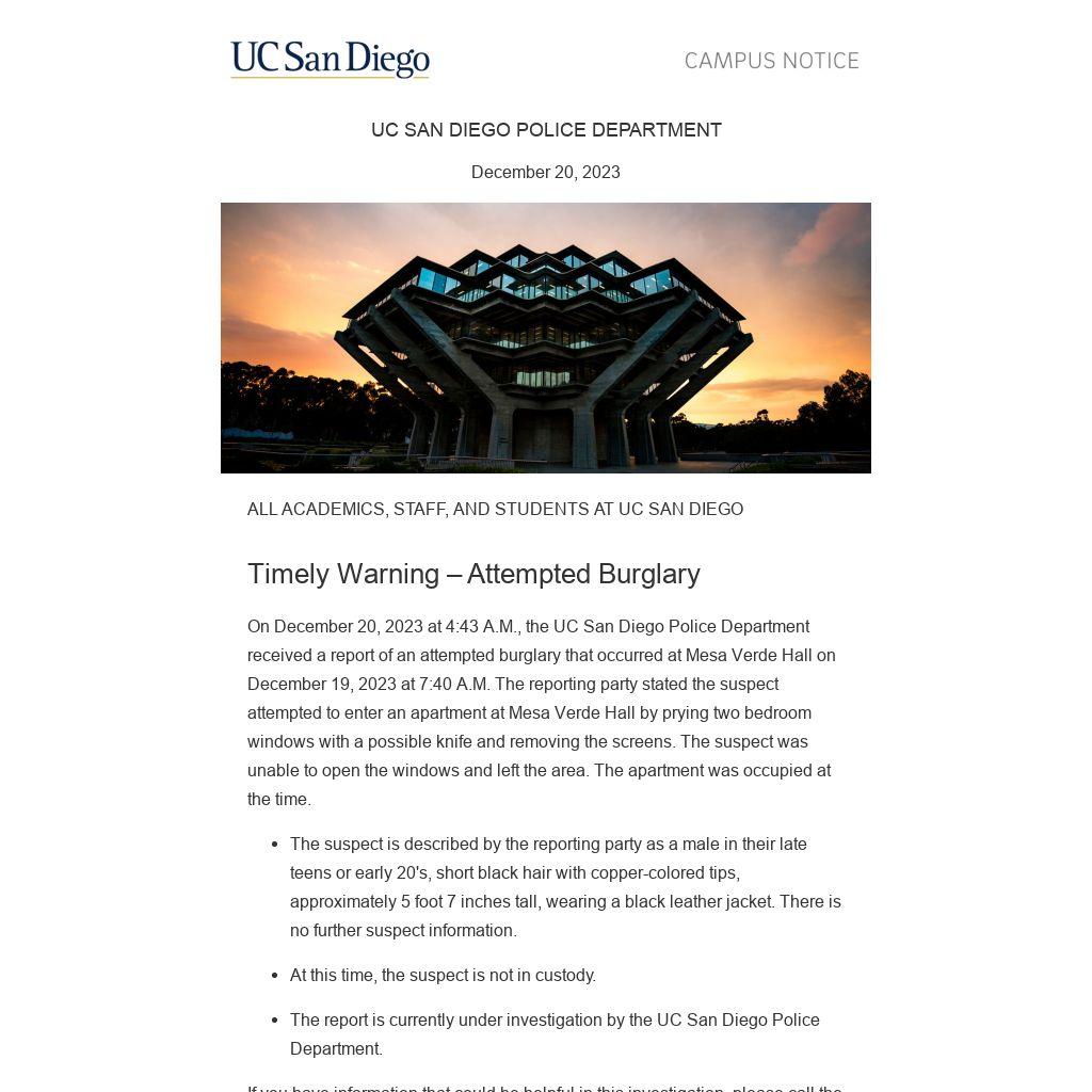 On December 20, 2023 at 4:43 A.M., the UC San Diego Police Department received a report of an attempted burglary that occurred at Mesa Verde Hall on December 19, 2023 at 7:40 A.M. The reporting party stated the suspect attempted to enter an apartment at Mesa Verde Hall by prying two bedroom windows with a possible knife and removing the screens. The suspect was unable to open the windows and left the area. The apartment was occupied at the time.