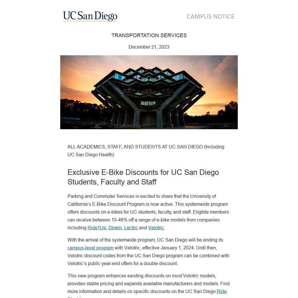 With the arrival of the systemwide program, UC San Diego will be ending its campus-level program with Velotric, effective January 1, 2024. Until then, Velotric discount codes from the UC San Diego program can be combined with Velotric’s public year-end offers for a double discount.