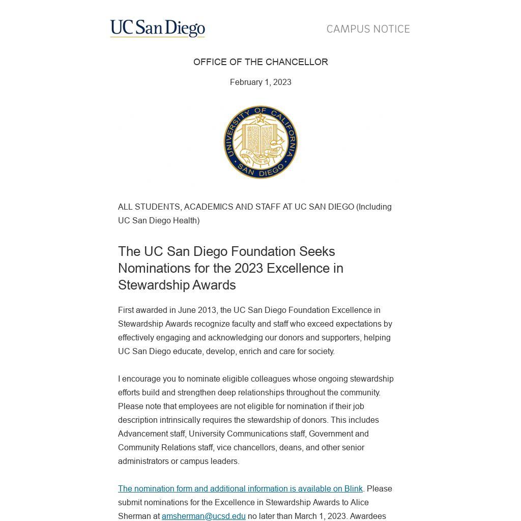 The nomination form and additional information is available on Blink. Please submit nominations for the Excellence in Stewardship Awards to Alice Sherman at amsherman@ucsd.edu no later than March 1, 2023. Awardees selected by the UC San Diego Foundation Donor Relations and Stewardship Committee will be notified in April and recognized by the UC San Diego Foundation in June 2023. Questions regarding the award program may also be directed to Alice Sherman.