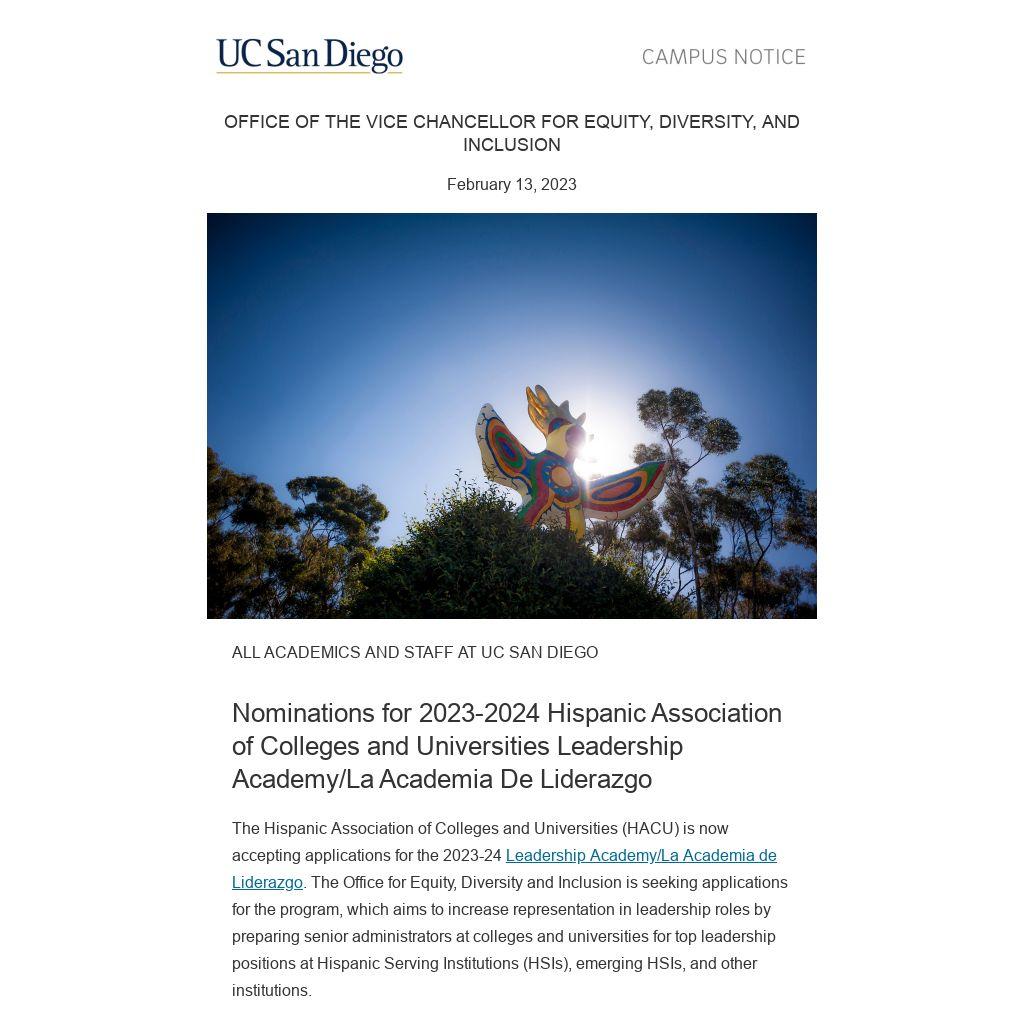 The Hispanic Association of Colleges and Universities (HACU) is now accepting applications for the 2023-24 Leadership Academy/La Academia de Liderazgo. The Office for Equity, Diversity and Inclusion is seeking applications for the program, which aims to increase representation in leadership roles by preparing senior administrators at colleges and universities for top leadership positions at Hispanic Serving Institutions (HSIs), emerging HSIs, and other institutions.