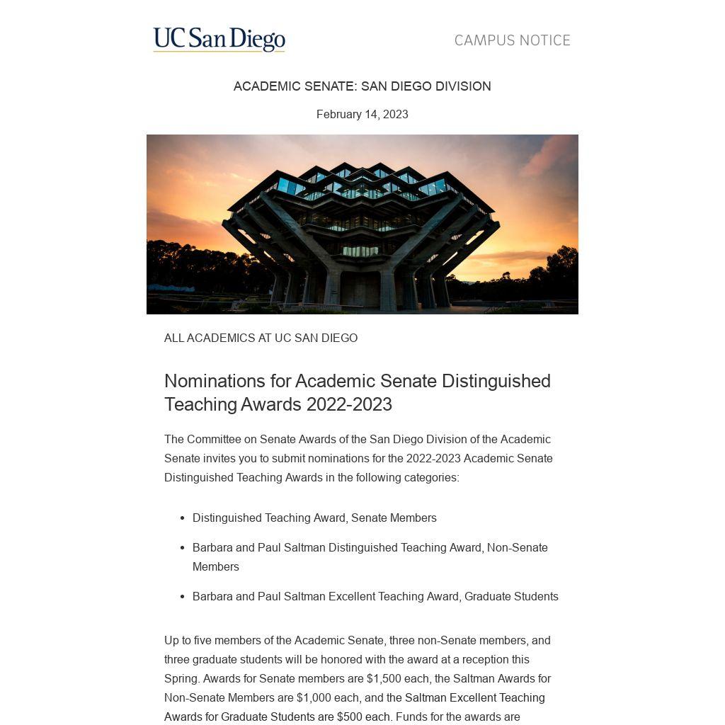 The Committee on Senate Awards of the San Diego Division of the Academic Senate invites you to submit nominations for the 2022-2023 Academic Senate Distinguished Teaching Awards in the following categories: