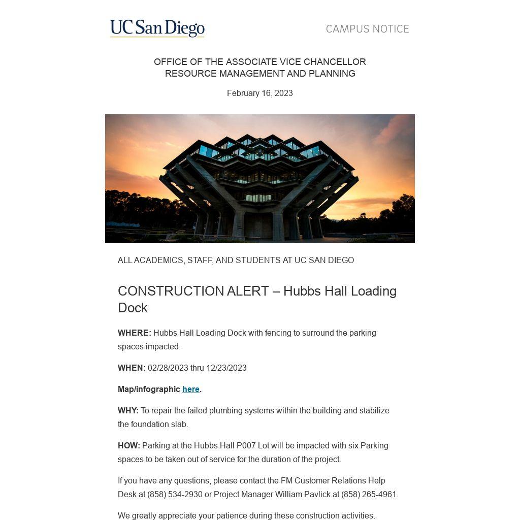 HOW: Parking at the Hubbs Hall P007 Lot will be impacted with six Parking spaces to be taken out of service for the duration of the project.