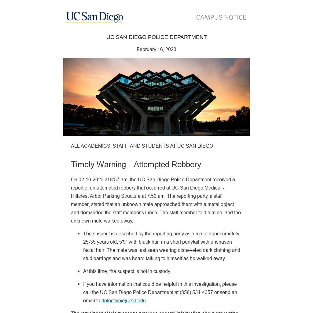 On 02-16-2023 at 8:57 am, the UC San Diego Police Department received a report of an attempted robbery that occurred at UC San Diego Medical - Hillcrest Arbor Parking Structure at 7:50 am. The reporting party, a staff member, stated that an unknown male approached them with a metal object and demanded the staff member's lunch. The staff member told him no, and the unknown male walked away.