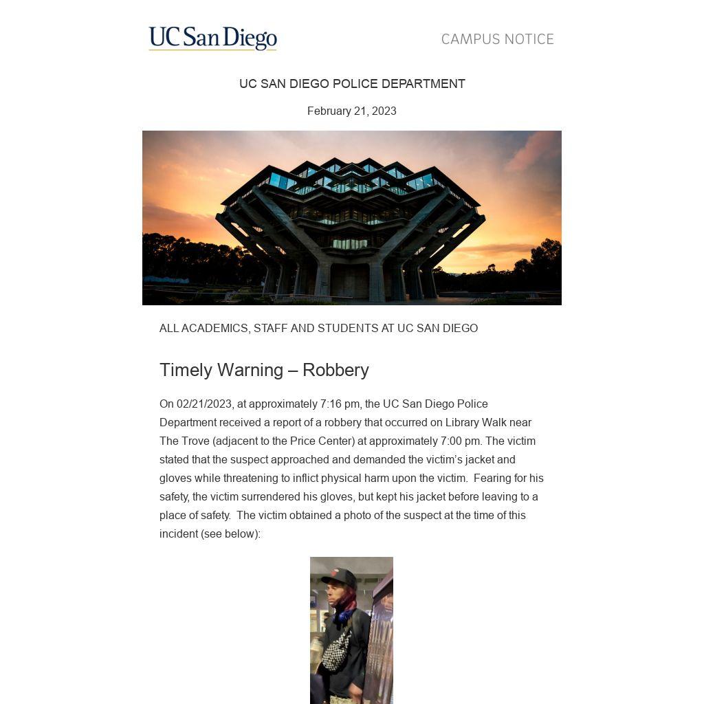 On 02/21/2023, at approximately 7:16 pm, the UC San Diego Police Department received a report of a robbery that occurred on Library Walk near The Trove (adjacent to the Price Center) at approximately 7:00 pm. The victim stated that the suspect approached and demanded the victim’s jacket and gloves while threatening to inflict physical harm upon the victim.  Fearing for his safety, the victim surrendered his gloves, but kept his jacket before leaving to a place of safety.  The victim obtained a photo of the suspect at the time of this incident (see below):