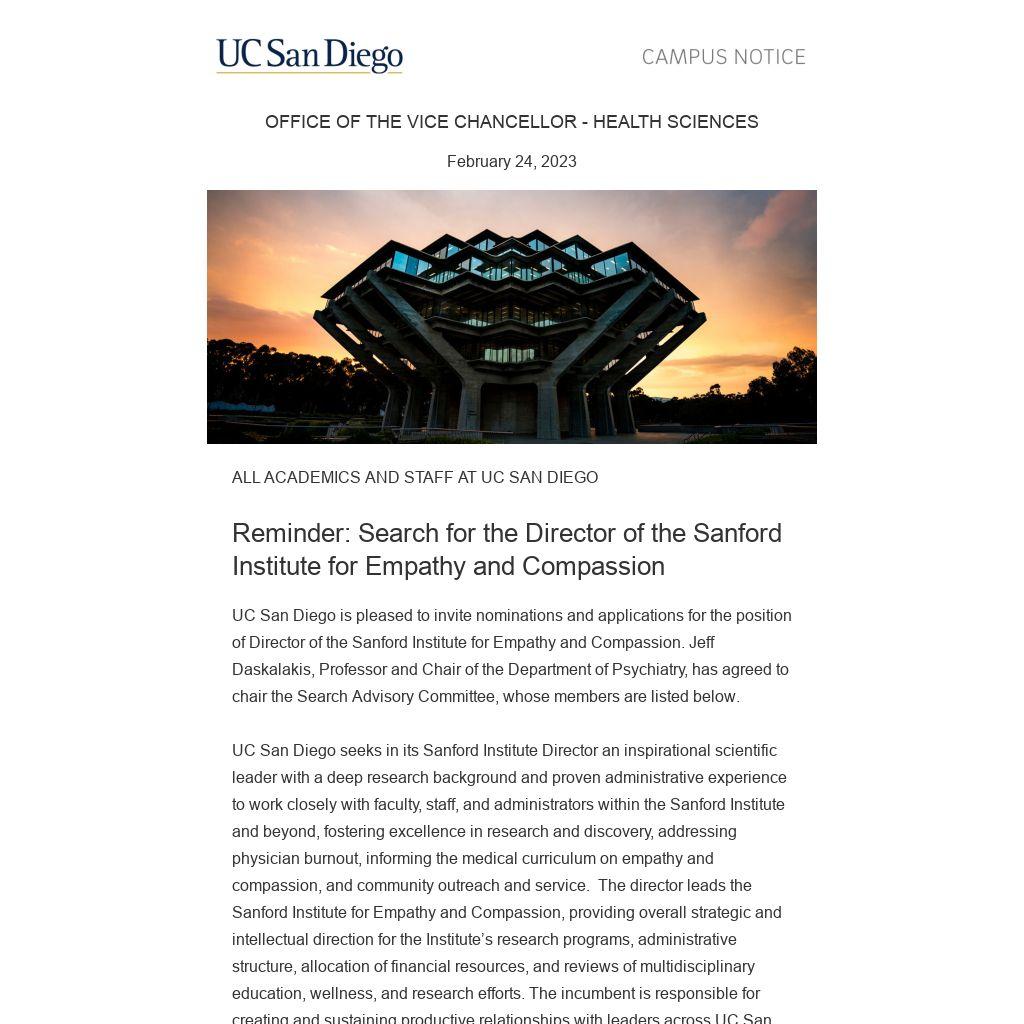 Reminder: Search for the Director of the Sanford Institute for Empathy and Compassion | |