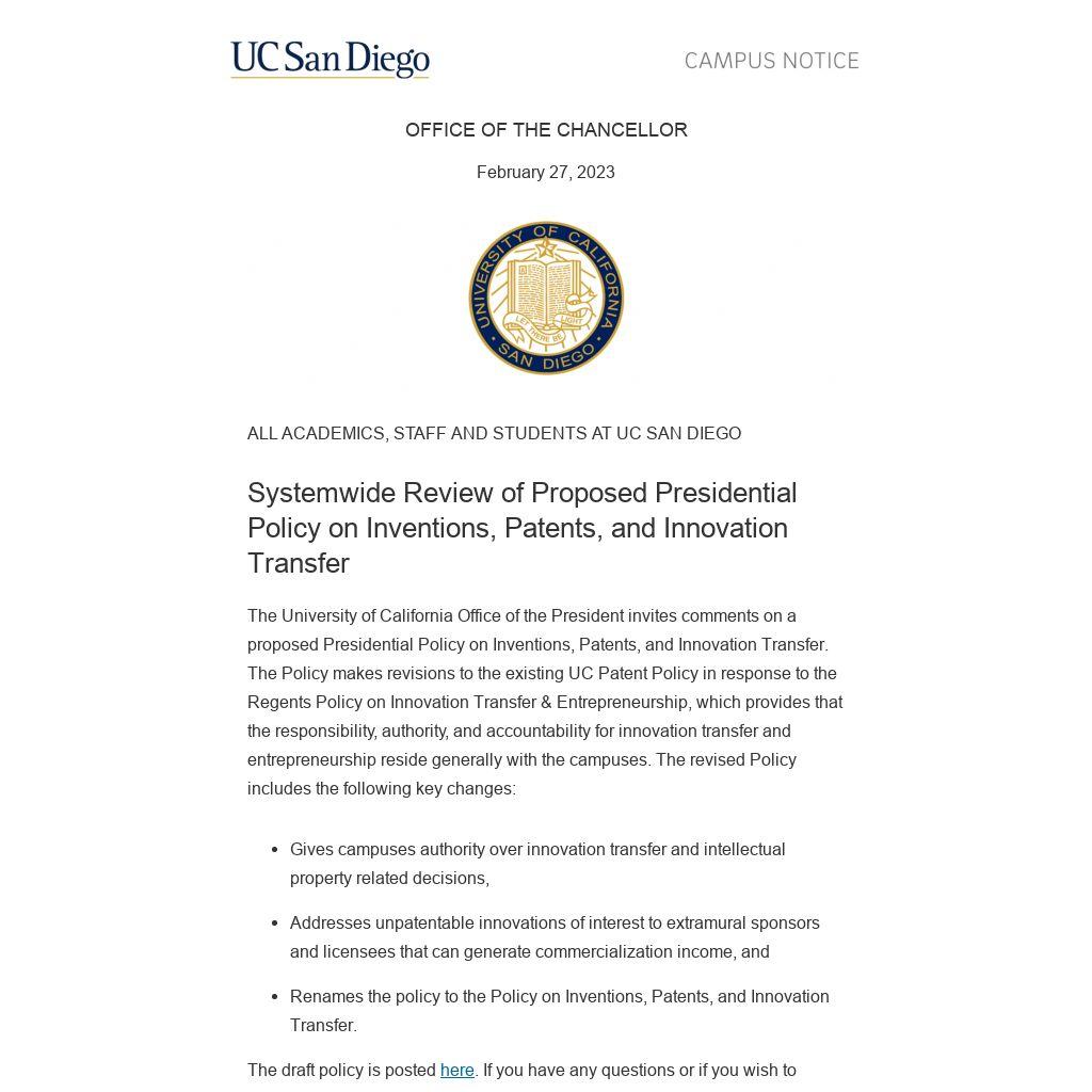 The University of California Office of the President invites comments on a proposed Presidential Policy on Inventions, Patents, and Innovation Transfer. The Policy makes revisions to the existing UC Patent Policy in response to the Regents Policy on Innovation Transfer & Entrepreneurship, which provides that the responsibility, authority, and accountability for innovation transfer and entrepreneurship reside generally with the campuses. The revised Policy includes the following key changes: