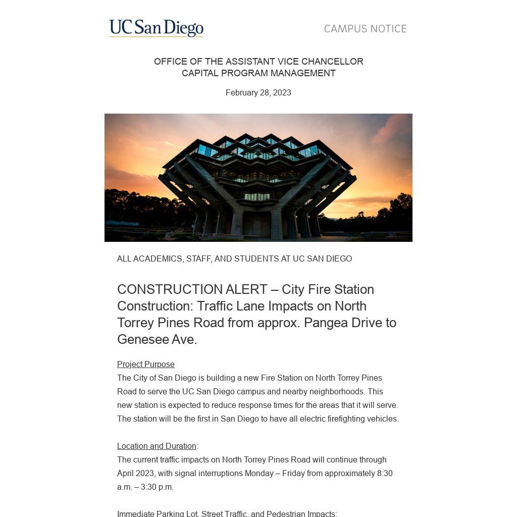 CONSTRUCTION ALERT – City Fire Station Construction: Traffic Lane Impacts on North Torrey Pines Road from approx. Pangea Drive to Genesee Ave.