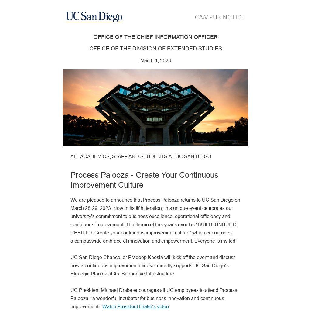 We are pleased to announce that Process Palooza returns to UC San Diego on March 28-29, 2023. Now in its fifth iteration, this unique event celebrates our university’s commitment to business excellence, operational efficiency and continuous improvement. The theme of this year's event is "BUILD. UNBUILD. REBUILD. Create your continuous improvement culture” which encourages a campuswide embrace of innovation and empowerment. Everyone is invited!