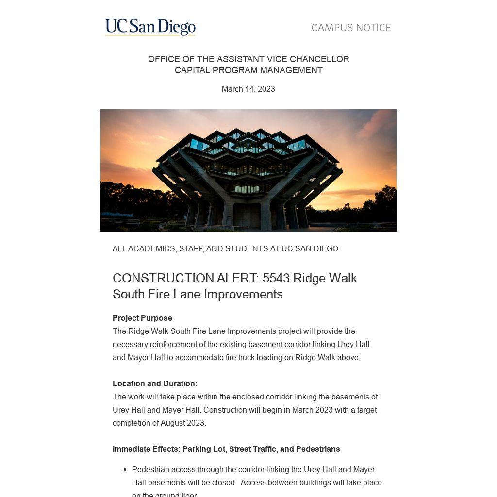 The Ridge Walk South Fire Lane Improvements project will provide the necessary reinforcement of the existing basement corridor linking Urey Hall and Mayer Hall to accommodate fire truck loading on Ridge Walk above.