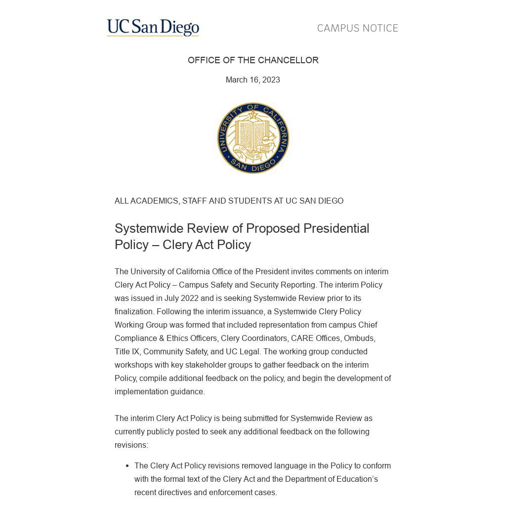 The interim Clery Act Policy is being submitted for Systemwide Review as currently publicly posted to seek any additional feedback on the following revisions: