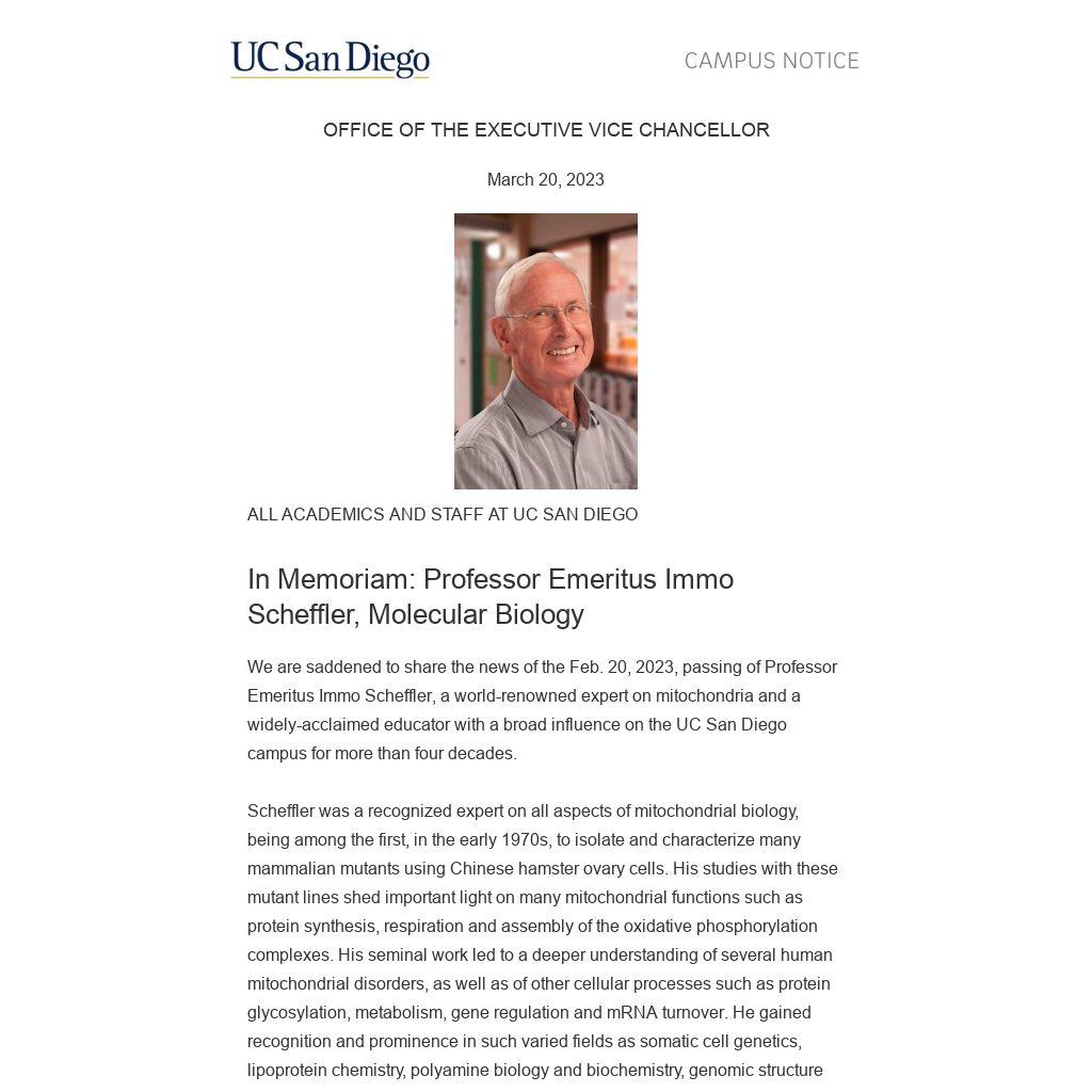 We are saddened to share the news of the Feb. 20, 2023, passing of Professor Emeritus Immo Scheffler, a world-renowned expert on mitochondria and a widely-acclaimed educator with a broad influence on the UC San Diego campus for more than four decades.
