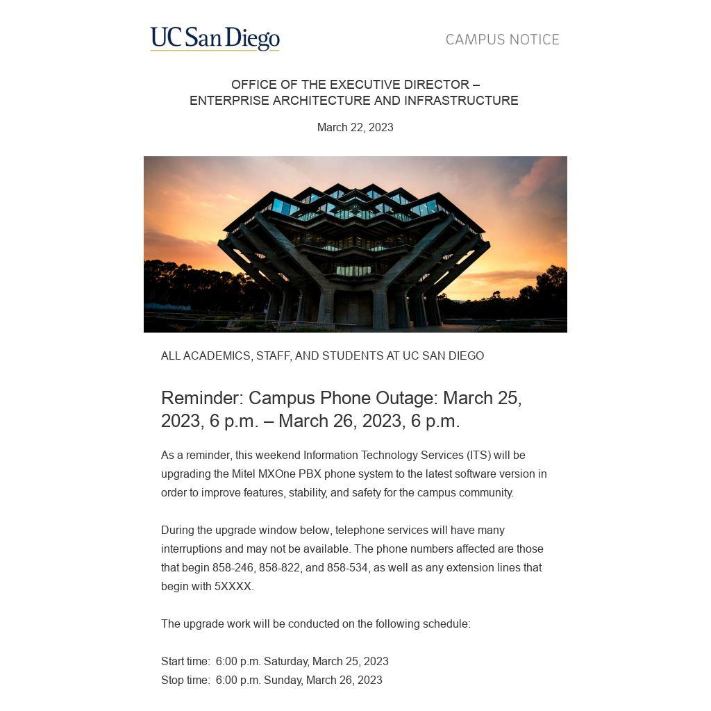 During the upgrade window below, telephone services will have many interruptions and may not be available. The phone numbers affected are those that begin 858-246, 858-822, and 858-534, as well as any extension lines that begin with 5XXXX.