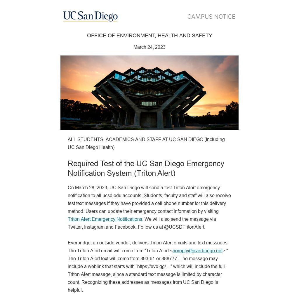 On March 28, 2023, UC San Diego will send a test Triton Alert emergency notification to all ucsd.edu accounts. Students, faculty and staff will also receive test text messages if they have provided a cell phone number for this delivery method. Users can update their emergency contact information by visiting Triton Alert Emergency Notifications. We will also send the message via Twitter, Instagram and Facebook. Follow us at @UCSDTritonAlert.