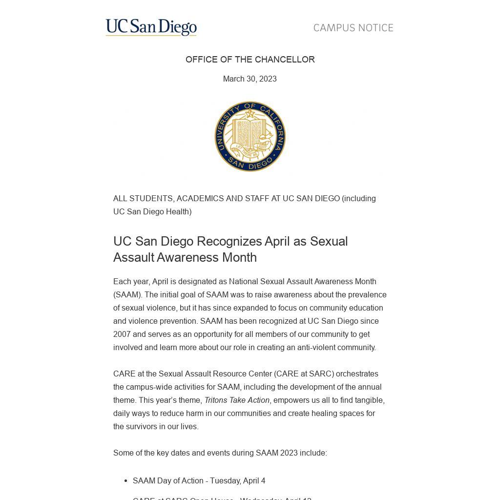CARE at the Sexual Assault Resource Center (CARE at SARC) orchestrates the campus-wide activities for SAAM, including the development of the annual theme. This year’s theme, Tritons Take Action, empowers us all to find tangible, daily ways to reduce harm in our communities and create healing spaces for the survivors in our lives.