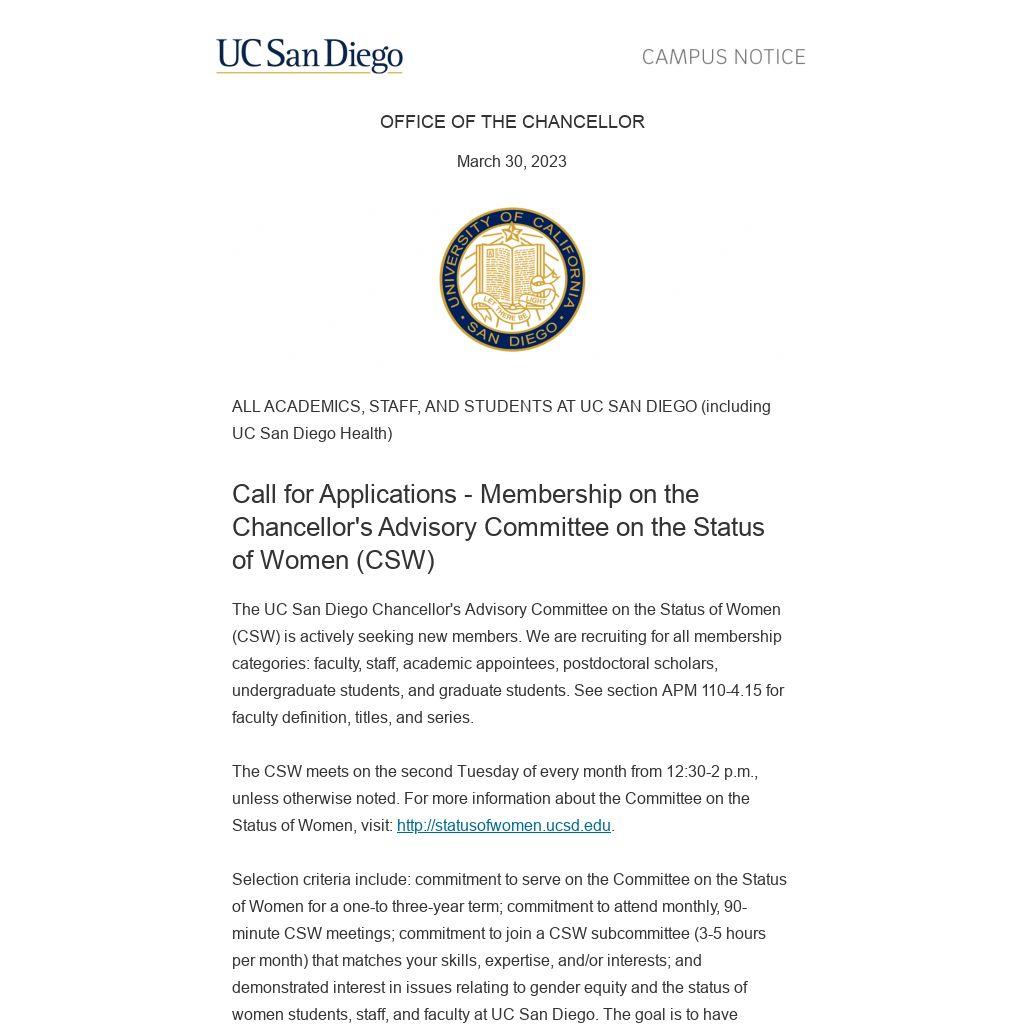 The UC San Diego Chancellor's Advisory Committee on the Status of Women (CSW) is actively seeking new members. We are recruiting for all membership categories: faculty, staff, academic appointees, postdoctoral scholars, undergraduate students, and graduate students. See section APM 110-4.15 for faculty definition, titles, and series.