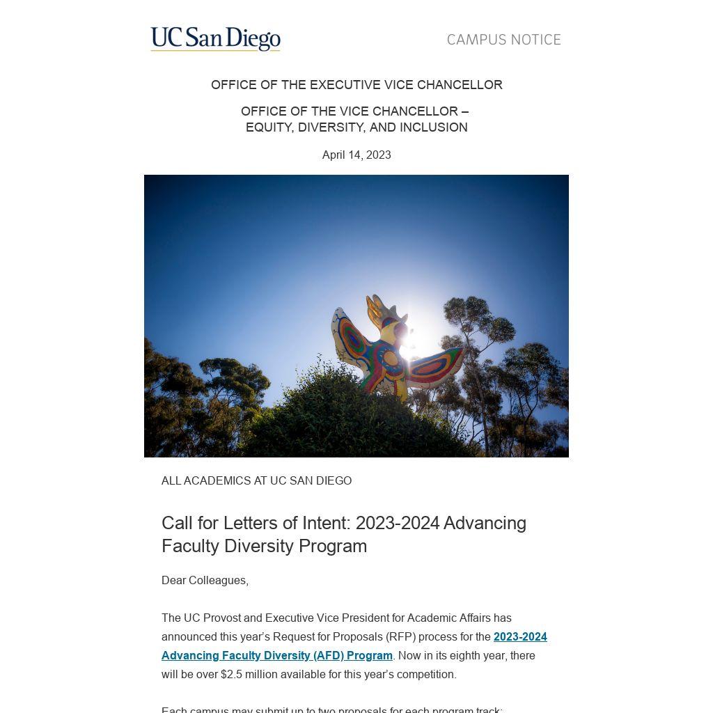 The UC Provost and Executive Vice President for Academic Affairs has announced this year’s Request for Proposals (RFP) process for the 2023-2024 Advancing Faculty Diversity (AFD) Program. Now in its eighth year, there will be over $2.5 million available for this year’s competition.