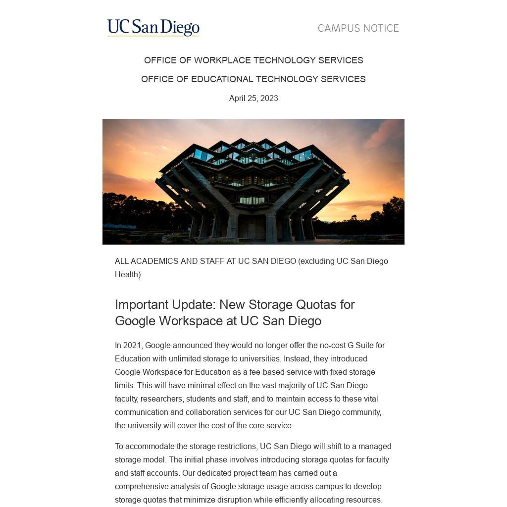 To accommodate the storage restrictions, UC San Diego will shift to a managed storage model. The initial phase involves introducing storage quotas for faculty and staff accounts. Our dedicated project team has carried out a comprehensive analysis of Google storage usage across campus to develop storage quotas that minimize disruption while efficiently allocating resources.