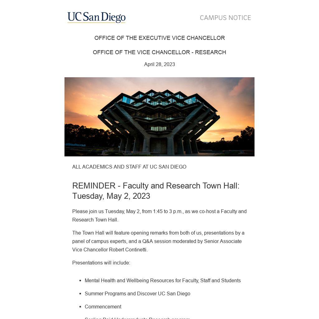 The Town Hall will feature opening remarks from both of us, presentations by a panel of campus experts, and a Q&A session moderated by Senior Associate Vice Chancellor Robert Continetti.
