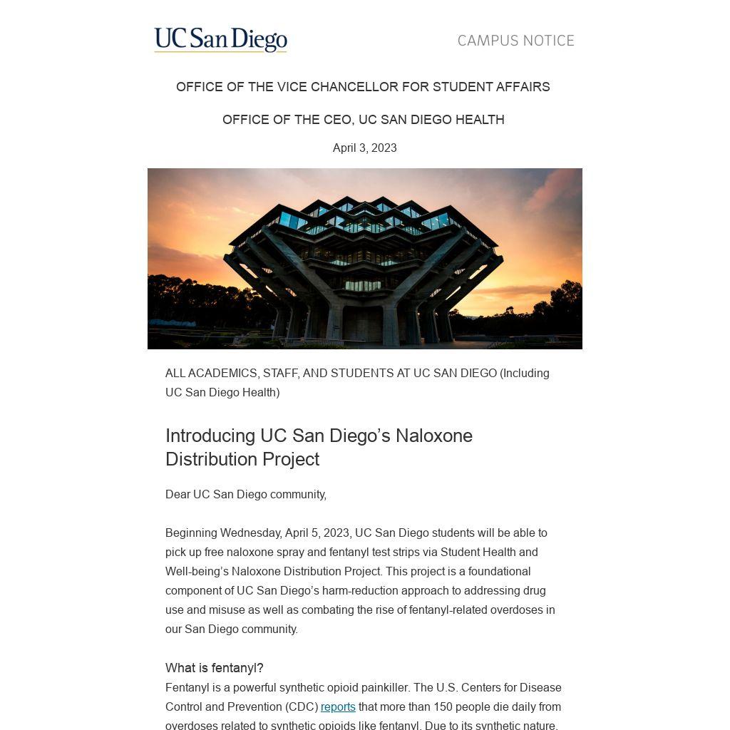 Beginning Wednesday, April 5, 2023, UC San Diego students will be able to pick up free naloxone spray and fentanyl test strips via Student Health and Well-being’s Naloxone Distribution Project. This project is a foundational component of UC San Diego’s harm-reduction approach to addressing drug use and misuse as well as combating the rise of fentanyl-related overdoses in our San Diego community.