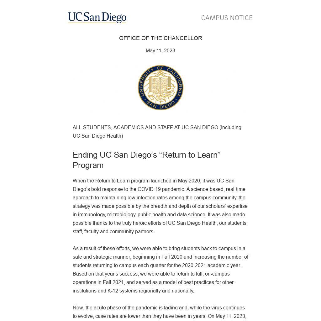 Any additional changes will be communicated to the campus community in a timely fashion, either through a campus notice and/or through the UC San Diego Today campus newsletter. Should you have any questions, please contact QHC-EOC@ucsd.edu.