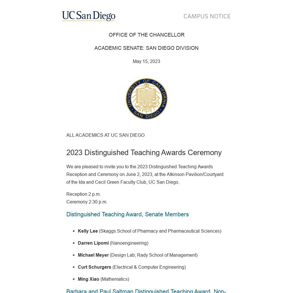 We are pleased to invite you to the 2023 Distinguished Teaching Awards Reception and Ceremony on June 2, 2023, at the Atkinson Pavilion/Courtyard of the Ida and Cecil Green Faculty Club, UC San Diego.