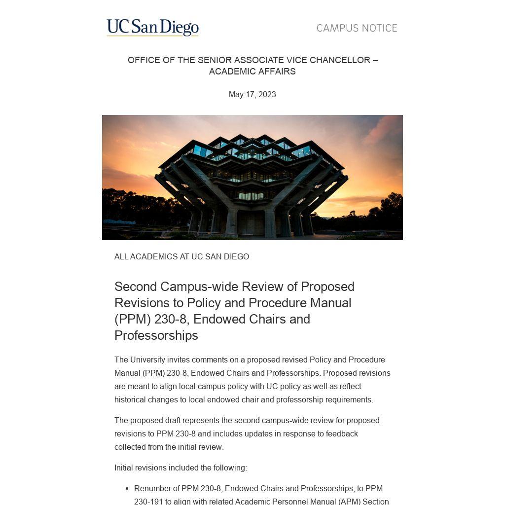 The University invites comments on a proposed revised Policy and Procedure Manual (PPM) 230-8, Endowed Chairs and Professorships. Proposed revisions are meant to align local campus policy with UC policy as well as reflect historical changes to local endowed chair and professorship requirements.