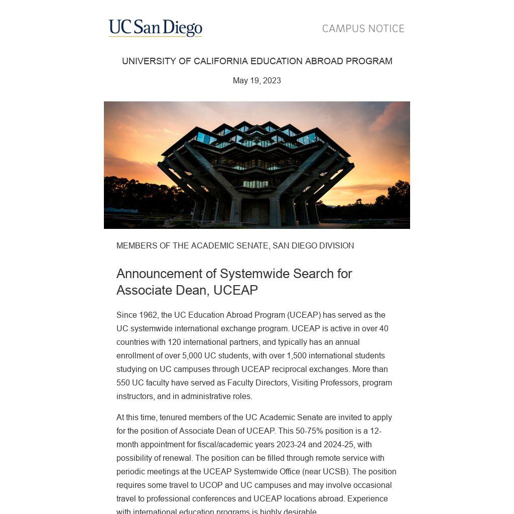 At this time, tenured members of the UC Academic Senate are invited to apply for the position of Associate Dean of UCEAP. This 50-75% position is a 12-month appointment for fiscal/academic years 2023-24 and 2024-25, with possibility of renewal. The position can be filled through remote service with periodic meetings at the UCEAP Systemwide Office (near UCSB). The position requires some travel to UCOP and UC campuses and may involve occasional travel to professional conferences and UCEAP locations abroad. Experience with international education programs is highly desirable.