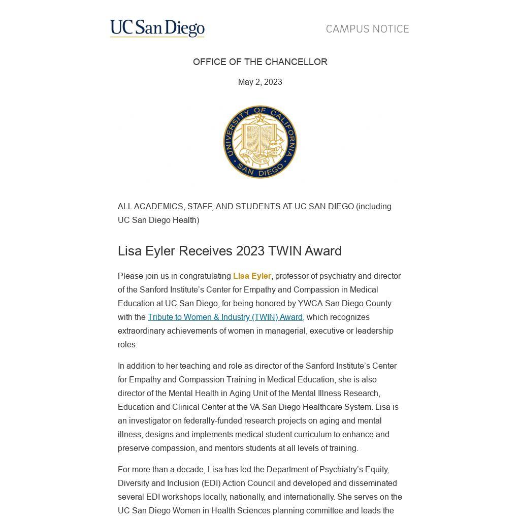 Please join us in congratulating Lisa Eyler, professor of psychiatry and director of the Sanford Institute’s Center for Empathy and Compassion in Medical Education at UC San Diego, for being honored by YWCA San Diego County with the Tribute to Women & Industry (TWIN) Award, which recognizes extraordinary achievements of women in managerial, executive or leadership roles.