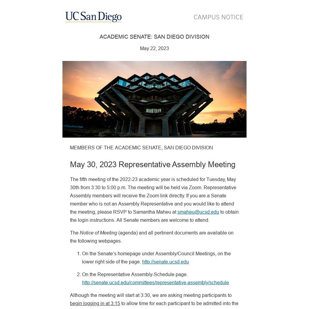 The fifth meeting of the 2022-23 academic year is scheduled for Tuesday, May 30th from 3:30 to 5:00 p.m. The meeting will be held via Zoom. Representative Assembly members will receive the Zoom link directly. If you are a Senate member who is not an Assembly Representative and you would like to attend the meeting, please RSVP to Samantha Maheu at smaheu@ucsd.edu to obtain the login instructions. All Senate members are welcome to attend.